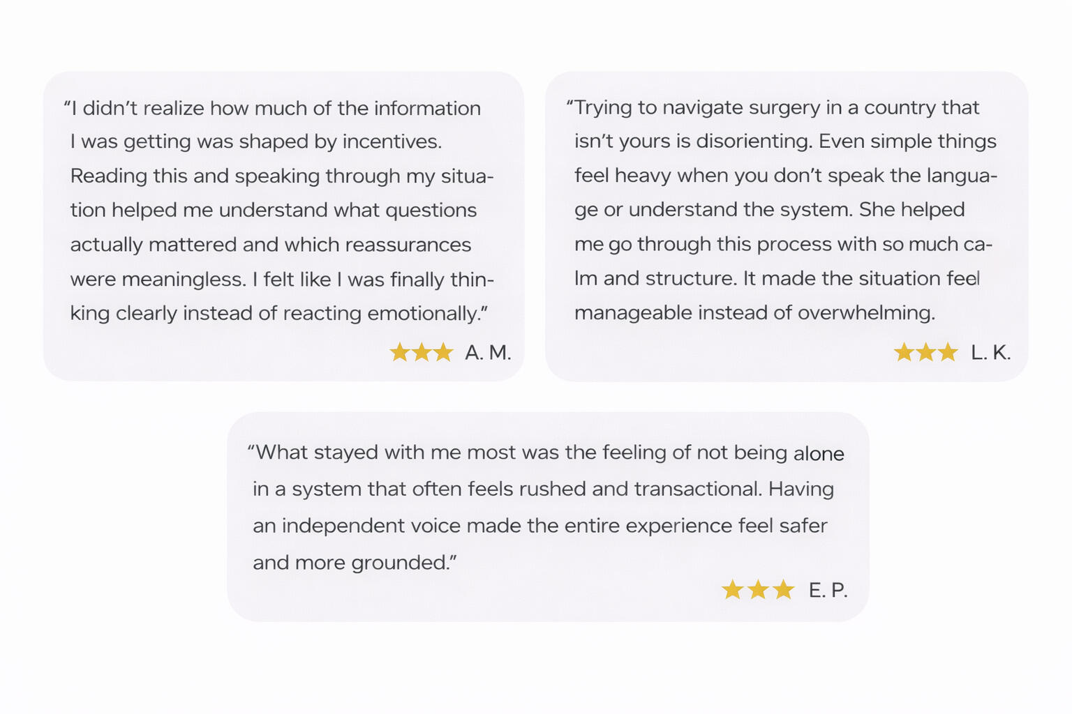 Ask about any doctor. Through my special access, I review training, background, surgical approach, and local plus international patient feedback, including information that is hard to find publicly.
